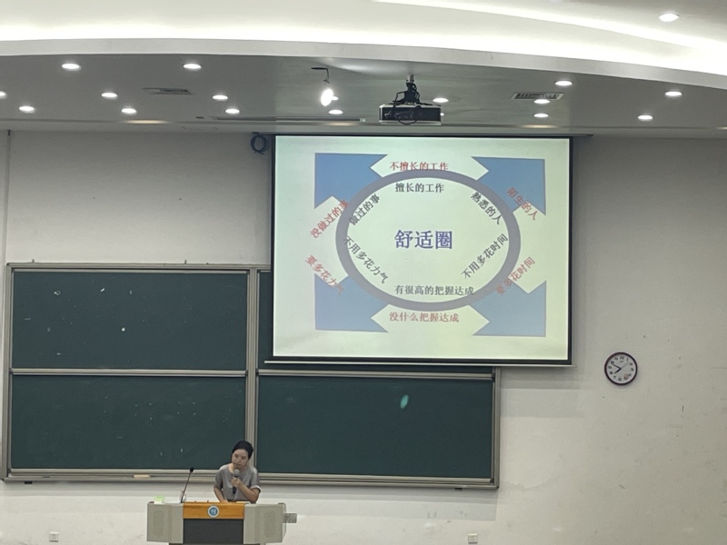 随后,许老师以“舒适圈”为切入点,引导新生重新审视大学生活的意义。“大学不是高中的终点,而是自我探索的新起点。”她鼓励同学们勇敢跳出熟悉的舒适区,尝试社团活动、学科竞赛等新鲜事物。