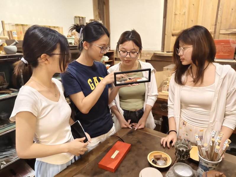 外国语系的志愿者们为参观者讲解着冷凝合香的制作工艺、香料特性及成品应用。冷凝合香、周氏喉科与洪家茶这三个非遗项目也同时参展。