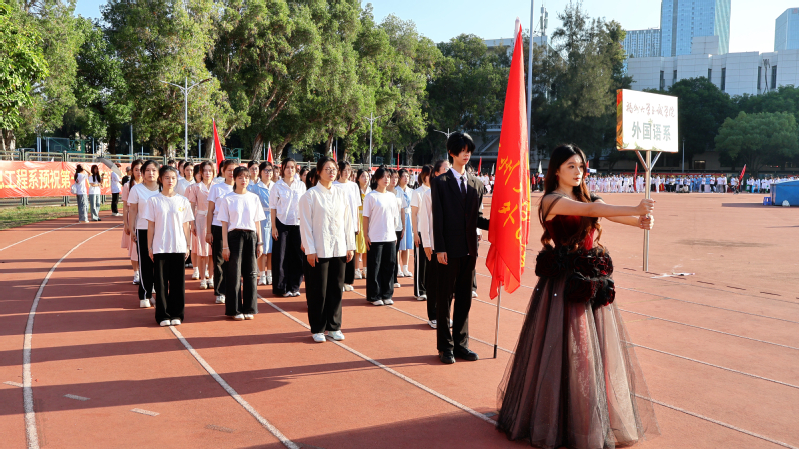 迎着升起的太阳,外国语队列方阵迈着整齐而坚定的步伐走向主席台。他们身着统一的服装,脸上洋溢着自信的笑容,眼神中透露出坚毅。当走到主席台前时,他们齐声喊出响亮的口号“外语学子,意气风发;驰骋赛场,勇闯天涯”,这声音响彻云霄,仿佛要将整个运动场都点燃。