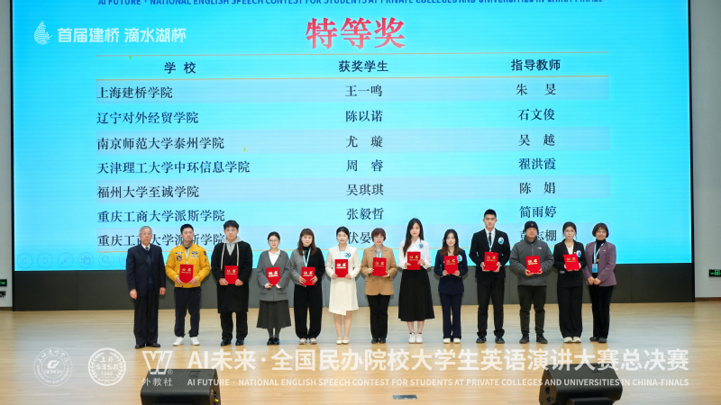 2025年12月27日,首届建桥“滴水湖杯”AI未来·全国民办院校大学生英语演讲大赛总决赛在上海建桥学院顺利举办。本次大赛由中国民办教育协会教育国际交流与合作专业委员会指导,上海建桥学院与上海外语教育出版社联合主办,赛事分校级初赛、省级复赛、全国总决赛三个阶段开展,吸引全国80余所民办高校万余名学子踊跃参赛。我系2023级英语专业学生吴琪琪在本次大赛中脱颖而出,斩获全国特等奖,为我院及我系斩获殊荣、增添光彩!