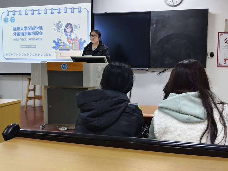 期末考试进行之际,假期也日渐临近。为强化学生安全防范与日常行为规范意识,2026年1月19日,外国语系2025级辅导员付伊爽老师为25级全体学生召开安全教育主题段会,围绕诚信应考、网络安全、假期安全等核心内容展开讲解与叮嘱。