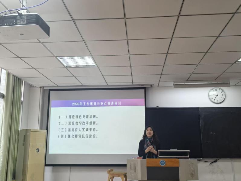 大会伊始,系主任甘振翎副教授首先代表外国语系全体教师向与会人员致以诚挚的问候,随后她围绕外国语系2026年四大重点推进项目展开了详尽的阐述。这四大重点项目包括:打造特色党建品牌,通过创新党建工作模式,提升党组织的凝聚力和影响力;深化教学改革创新,结合新时代教育需求,推动课程体系和教学方法的优化升级;拓宽育人实践渠道,加强校企合作与实习基地建设,为学生提供更多实践机会;优化师资队伍建设,加强教师培训,提升整体教学水平。在全面介绍完这些重点内容后,会议顺利进入专项工作部署环节。