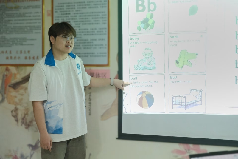 课堂伊始,志愿者们以生动有趣的方式,带领孩子们认识以A、B、C开头的基础英文单词。从apple到ball,再到cake,每个单词都搭配形象的手势与实物联想,帮助孩子们理解与记忆。